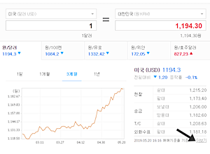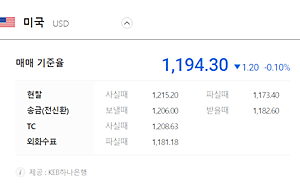 위와 같은 환율이 나오는데 1달러를 살려면 이날의 환율대로 1,194원이라고 생각하는 경우가 많은데 보낼때, 송금할 때는 더 내야하고, 팔때나, 송금 받을 때는 더 낮은 환율이 적용되며 날짜별로 확인하기 위해서 아래에 더보기를 클릭하세요.