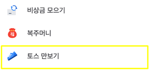 전체 메뉴에서 토스 만보기가 생겼는지 확인하면 되는데 만약 토스 만보기 메뉴가 확인되지 않는다면 앱을 껐다가 다시 실행해보면 되겠습니다.