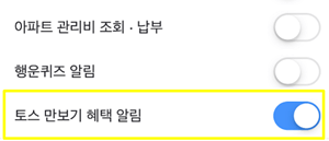 토스 만보기 혜택 알림이 기본설정으로는 비활성화 되어 있는데 이를 클릭하여 활성화 시켜줍니다.