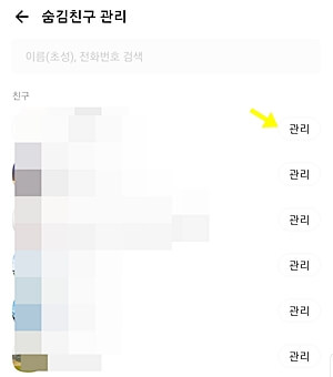숨김친구 관리로 들어가면 숨친 친구들이 목록이 나타나는데 여기서 삭제했다고 생각한 친구가 보인다면 오른쪽에 관리를 눌러주어 친구목록으로 복귀를 선택하면, 카톡 친구삭제 복구가 완료됩니다.