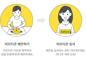 카카오톡 이모티콘 만들기 제안서를 작하면 심사가 진행되는데 최소 2주에서 4주 정도 소요된다고하니 생각하는 개성있는 캐릭터와 디자인으로 이모티콘 또는 움직이는 이모티콘을 만들어 볼 수 있으며 누군가가 구매를 한다면 수익도 얻을수 있습니다.
