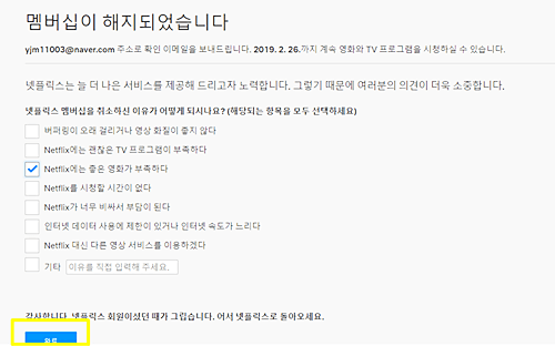 멤버십이 해지가 되었습니다 라는것이 뜨고, 저는 취소하는 이유를 박스에 체크 후 완료버튼을 누르면 해지를 하더라도 기존에 한달 무료 시청 신청한것은 영화나 TV 프로그램을 마지막날까지 이용이 가능하겠습니다.