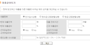 대출계산기에서 대출갈아타기 버튼을 클릭하면 중도상환수수료 계산기 사용이 가능하며 대출 종류 만기일시상환, 원리금 균등분할상환,원금 균등분할상환 중 선택하고, 현재 대출잔액,대출 잔여기간,현재 대출 금리,신규 대출금리를 작성합니다.