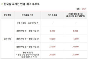 국제선 변경 수수료도 확인하실 수 있는데 일반운임과 스마트운임은 구매다음날부터 출발 91일전까지 수수료가 부과 되지 않으며 촐발 30일전부터 출발 50분전까지 가장 높은 변경,취소 수수료를 부과하고 있습니다.