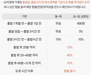 ktx 취소 수수료는 출발 3시간전부터 출발시간전까지 취소를 하면 기차표 는 10%이고, 기차 출발 후 목적지 도착전 수수료는 요일에 상관없이 20분경과 15%, 60분경과 70% 의 수수료가 발생합니다.