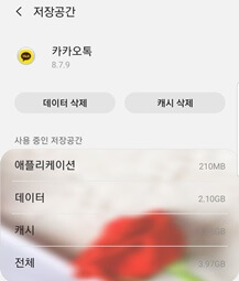 어플리케이션에서 카카오톡 어플을 찾은 후 들어가면 저장공간 을 한번 더 들어갑니다.데이터 삭제를 선택하면 저장된 모든 데이터 파일, 설정값, 계정 데이터 삭제가 됩니다.