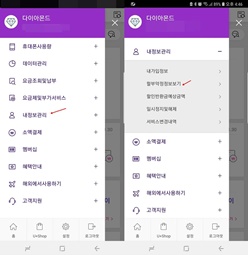 맨 왼쪽 상단에 줄3개를 클릭하면 나의 멤버쉽 등급과 함께 여러가지 휴대폰 정보를 확인할 수 있는데 여기서 "내 정보 관리"를 클릭합니다.