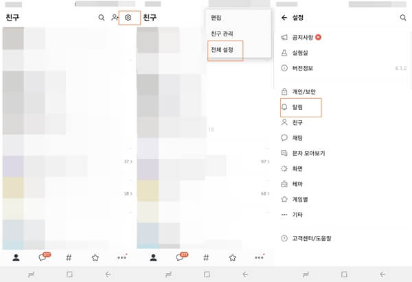 이때 카톡 친구 화면에서 맨 위에 톱니바퀴에서 전체설정을 들어가서 알림을 들어가면 키워드 알림이라고 있는데 여기서 카톡 키워드 알림 설정을 하면되고, 총 20개까지 다양하게 등록이 가능합니다.
