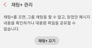 그룹 채팅을 할 수 없고, 읽었던 메시지 내용을 확인하거나 대용량 파일 공유도 안됩니다. 채팅+켜기 버튼이 보인다면 갤럭시 문자 읽음 서비스가 꺼진 상태로 기능이 다시 활성화됩니다.