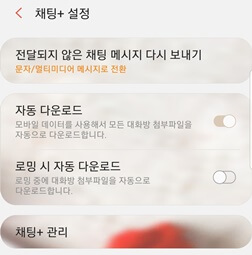 설정 화면을 들어가면, 채팅+설정 카테고리 선택 후 채팅+관리를 선택합니다.채팅+끄기 버튼이 보인다면 클릭하게되면 갤럭시 문자 읽음 표시가 비활성화 됩니다.