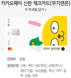 오프라인에서 사용을 원할시에는 실물 카드를 받은 후 사용 가능한데 저는 신청한지 2틀안에 받았고, 보통 5일이내 받을수 있습니다. 카카오페이 신한 무지 체크카드는 마스터로만 발급되며, 체크카드이기때문에 별도 연회비는 없으며 후불교통 기능으로 발급 가능합니다.신한은행 계좌 아닌 우리, KB 국민, 하나, IBK 기업, NH 농협, 부산, 대구, 광주, 전북, 제주은행 계좌를 결제계좌로 할 수 있습니다.