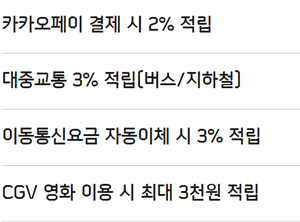 전월 실적 1일~ 말일까지 국내/외 이용금액 30만원 이상부터 대중교통, 통신요금, 영화 3% 적립으로 월 통합 적립한도 5천점까지 됩니다.휴대폰 요금 자동이체는 건당 5만원 이상 청구건입니다. 핸드폰 약정금액 대납, 알뜰폰 적립 제외하고, 전월실적 50만원 이상이면 월 통합 적립한도 7천점, 전월 70만원 이상 시, 월 통합한도 1만점, 전월 100만원 이상 시, 월 통합한도 1만 3천점 내에서 대중교통, 영화, 통신비 적립을 받을 수 있습니다.