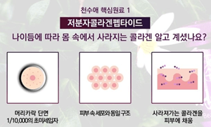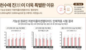 식품 안에 존재하는 콜라겐은 분자 크기가 너무 커서 피부 속까지 흡수되지 않는다고해요. 천수애 성분은 콜라겐 분자를 쪼개어 작은 크기로 만든 것으로 몸에 흡수가 잘되게 만들어진 이너뷰티 제품입니다.