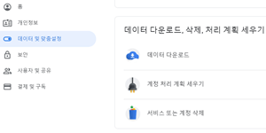 서비스 또는 계정 삭제 페이지에는 현재 사용하고 있는 서비스들이 나오는데 지메일, 유튜브등이 나오며 서비스를 삭제하기 전에 백업을 받고 싶다면 "데이터 다운로드" 를 눌러 진행합니다.