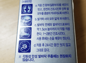 완전히 스며들 수 있도록 24시간 동안은 씻지 않아야하고, 바르고나서는 2분 동안 완전히 스며들동안 건조시키면됩니다.양말에 무좀균이 남아 있을 수가 있으니 양쪽 발에 골고루 같이 발라 주시는 것이 좋아요.