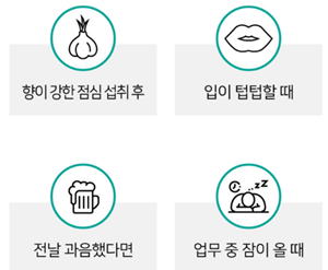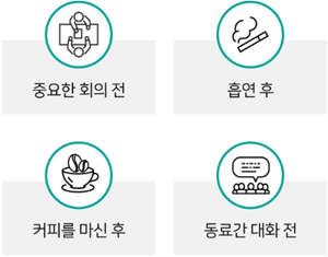 잇퓸은 특히 직장인들에게 중요한 회의나 흡연이나 커피를 마신 후에는 강한 입냄새를 유발하게 되는데 이 경우에도 유용하게 활용될 수 있습니다. 전날 과음이나 양파, 마늘, 파와 같은 향이 강한 음식을 먹었을때도 좋겠습니다.
