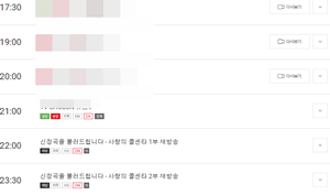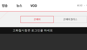 우측 상단에 "ON"을 클릭해 주면, 상단 메뉴에는 온에어와 온에어플러스가 있습니다. 온에어는 실시간이고, 플러스는 재방송 채널입니다.