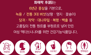 화애락본은 20대 이상의 성인 여성이 먹을수 있고, 홍삼 외에 당귀, 작약, 대나무잎, 복령, 백출 등의 전통 소재와 대두, 석류, 구기자, 크랜베리, 레몬밤의 부소재를 담았다고합니다.