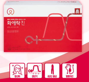 정관장 화애락진은 홍삼의 하루 권장량인 3g을 충족하는 4.88g/포와 녹용, 당귀, 작약, 백출, 대나무잎, 복령과 석류, 콩코드포도 등의 성분으로 갱년기 전후의 중년 여성을 위하여 특화된 상품이라고하며 꾸준한 인기상품이라고합니다.