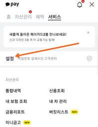 카카오페이에 들어가면 홈 , 자산관리, 혜택 그옆에 서비스를 누르고, 아래 보이는 설정을 터치합니다.