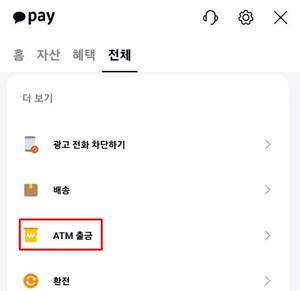 통장이랑 연동되어 있어 자동 충전하여 카톡으로 송금을 많이 하다 보니 현금 쓸 일이 잘 없지만 급한 사유로 필요할 때 근처 ATM 기기를 찾은 후 카드 없이 출금할 수 있습니다.